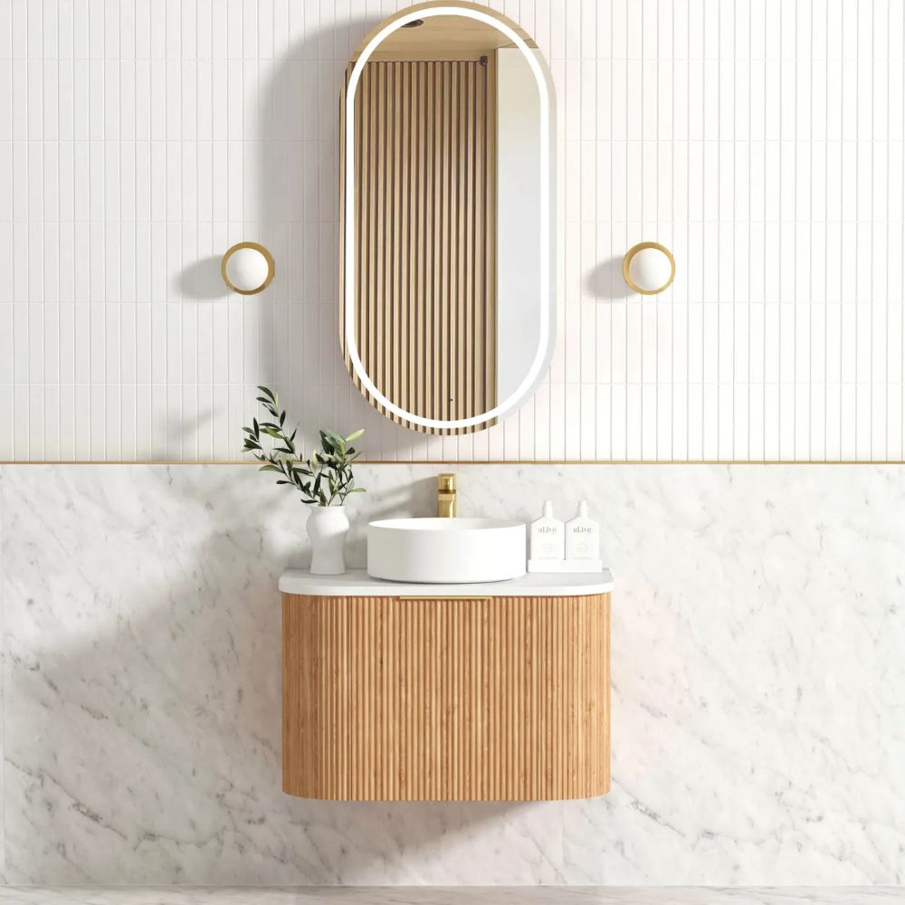 Be the first to review “BONDI FLUTED 0750mm Woodland Oak Curve Vanity, Silicia Free Matte White”