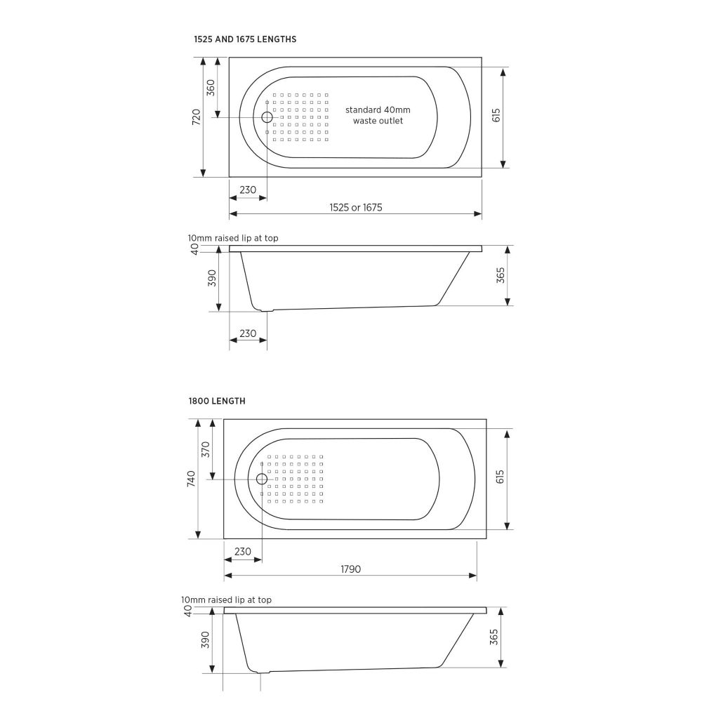 • Sizes: 1525 x 720 x 390mm; 1675 x 720 x 390mm; 1790 x 740 x 390mm