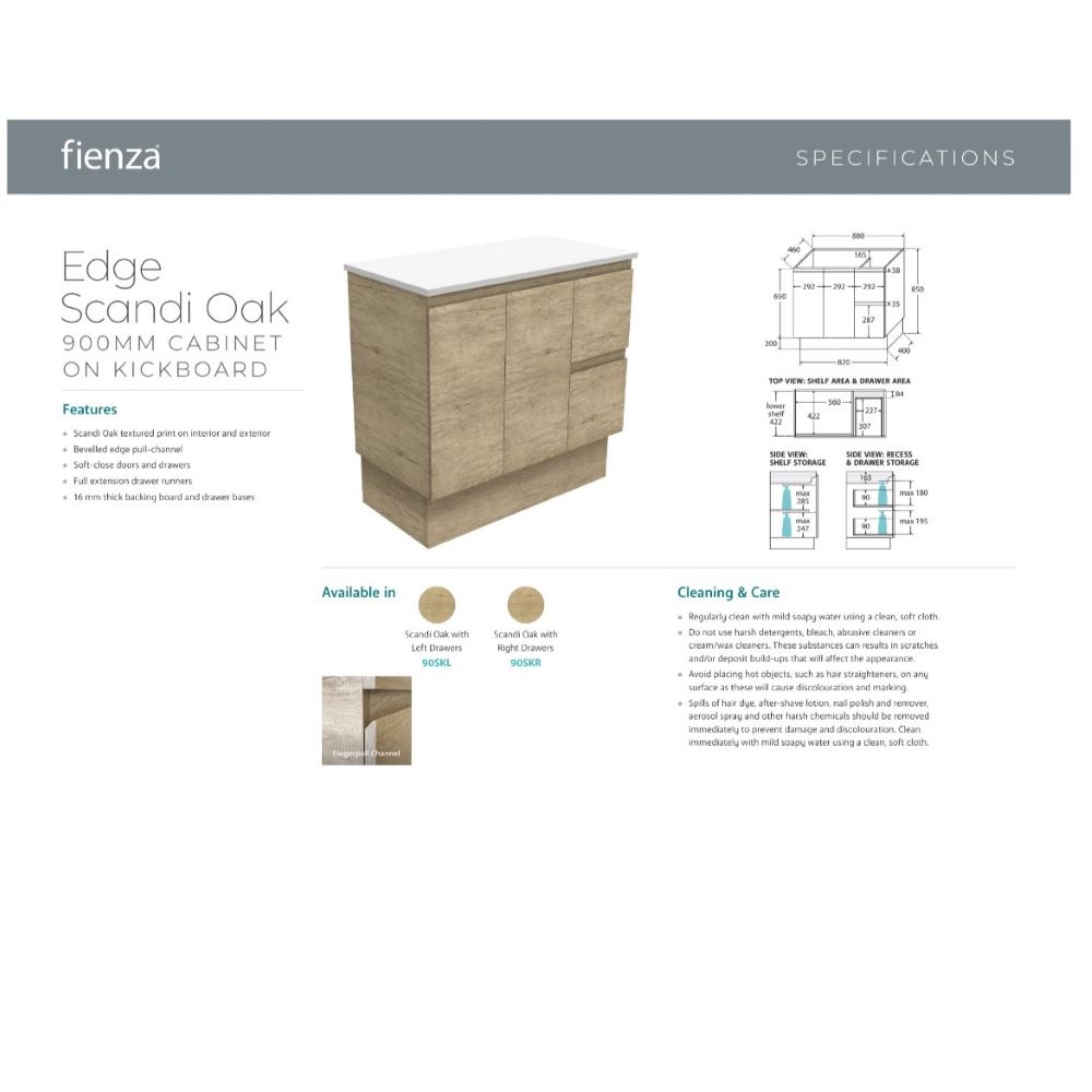 The Edge Scandi Oak Floor Mount 900 Cabinet on Kickboard features convenient left-hand drawers. Made with high-quality Scandi Oak, this cabinet will add a touch of elegance to any space. Perfect for keeping your belongings organized and easily accessible.