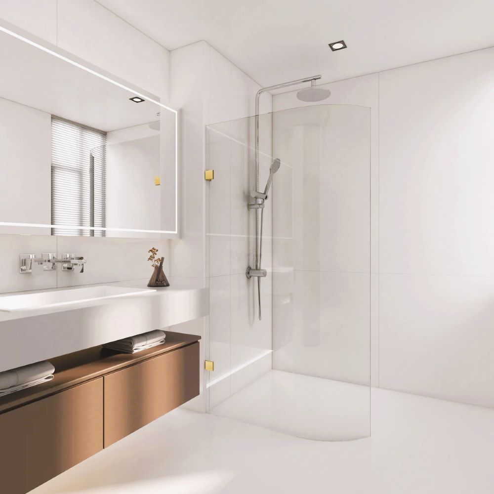 Be the first to review “Frameless Curved Glass Walk In Shower Screen, Light Gold 1000mm”
