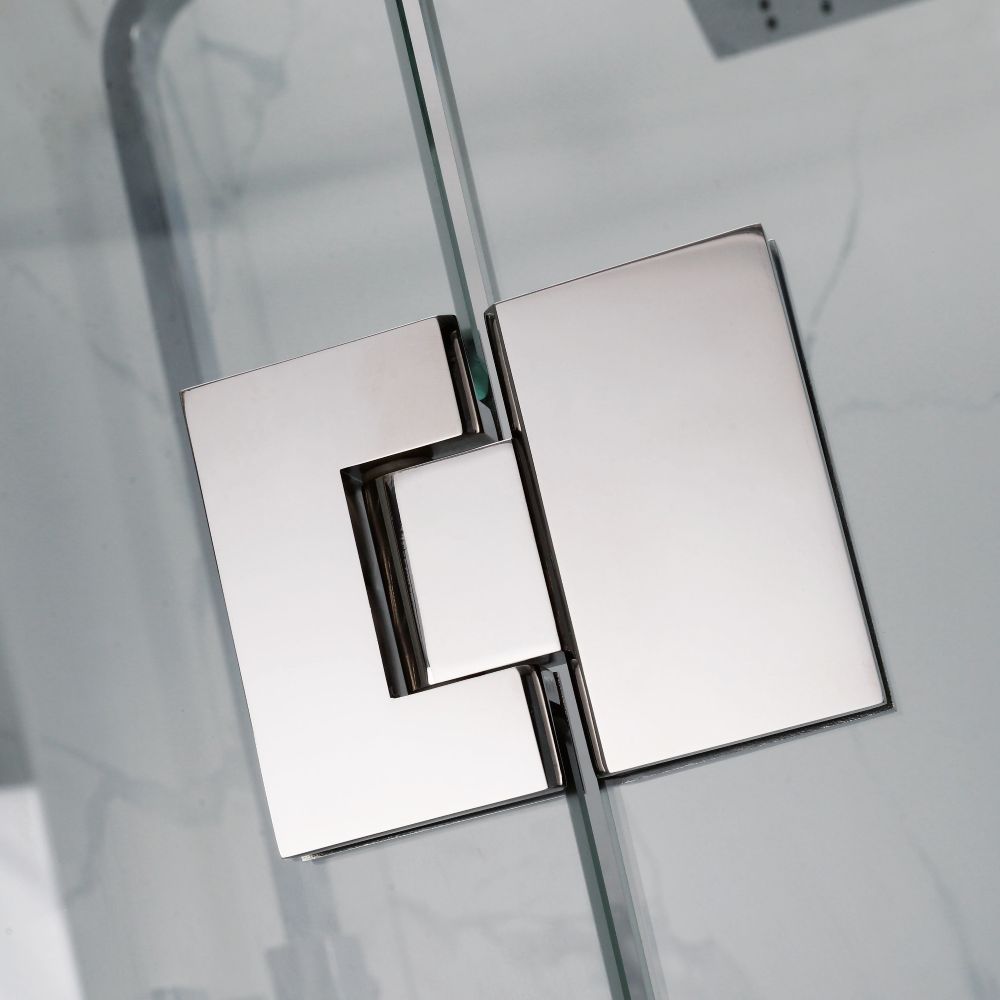 The Frameless Square Corner Shower Screen with a Hinge Door features a sleek and modern design. Made with high-quality chrome, this shower screen adds a touch of elegance to any bathroom. The frameless construction enhances the minimalist look, creating a spacious and open feel in your shower area.