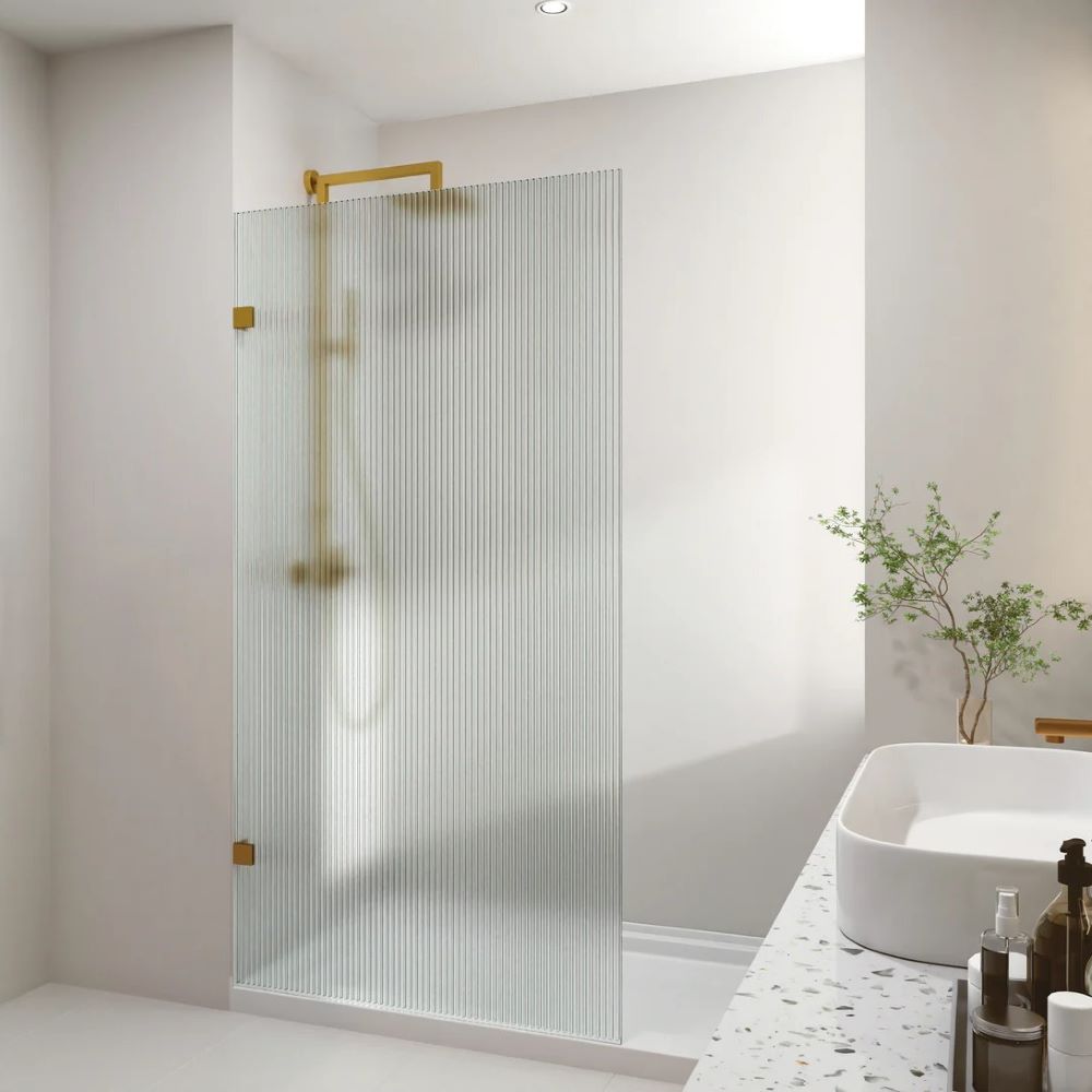 Frameless Walk In Fluted Glass Shower Panel with Brackets, Brushed Gold 0900mm