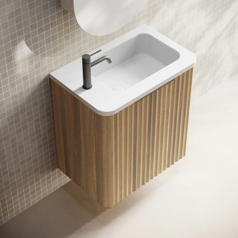 GRAVITY Fluted Wall Hung Vanity, Natural Oak, Right Hand Hinge, Left Hand Basin, Matte Black Handle 0500mm