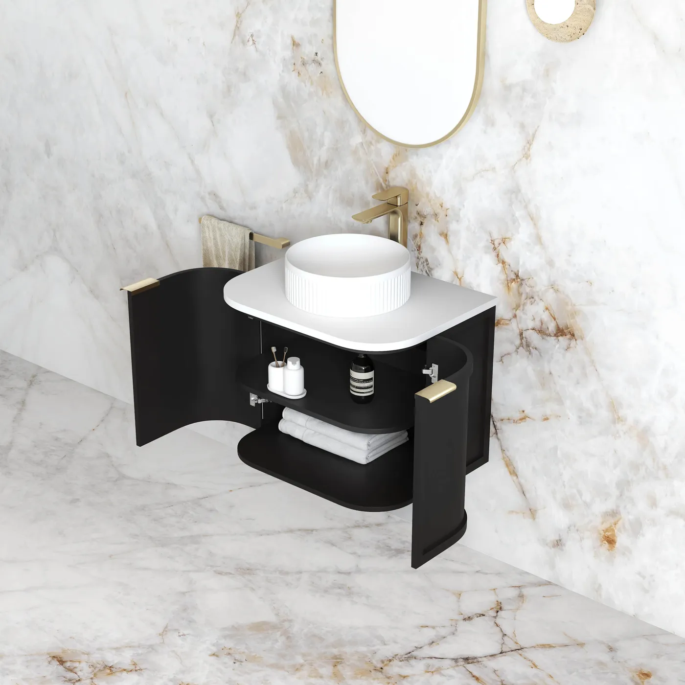 Be the first to review “HAMPSHIRE Satin Black Wall Hung Curve Vanity 600mm, Pure White Stone Top, Brushed Gold Handles”