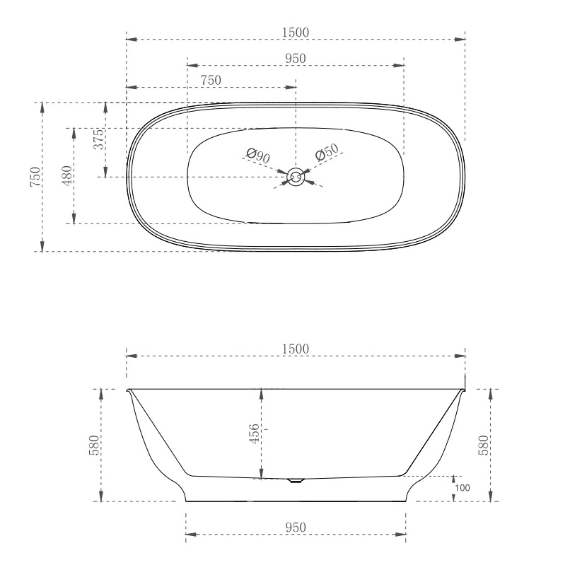 Dimensions 1500 × 750 × 580 mm