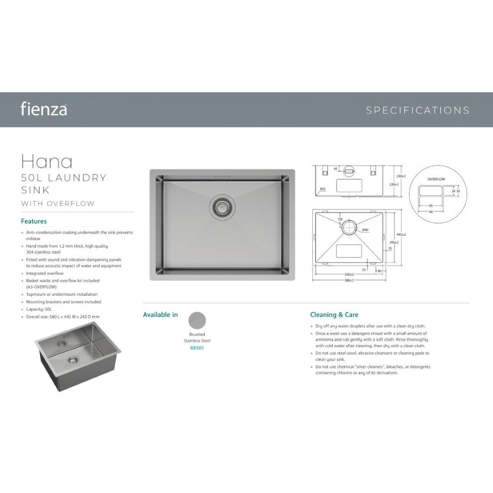 - Includes: Hana 55L Single Kitchen Sink (SEQ-68405)