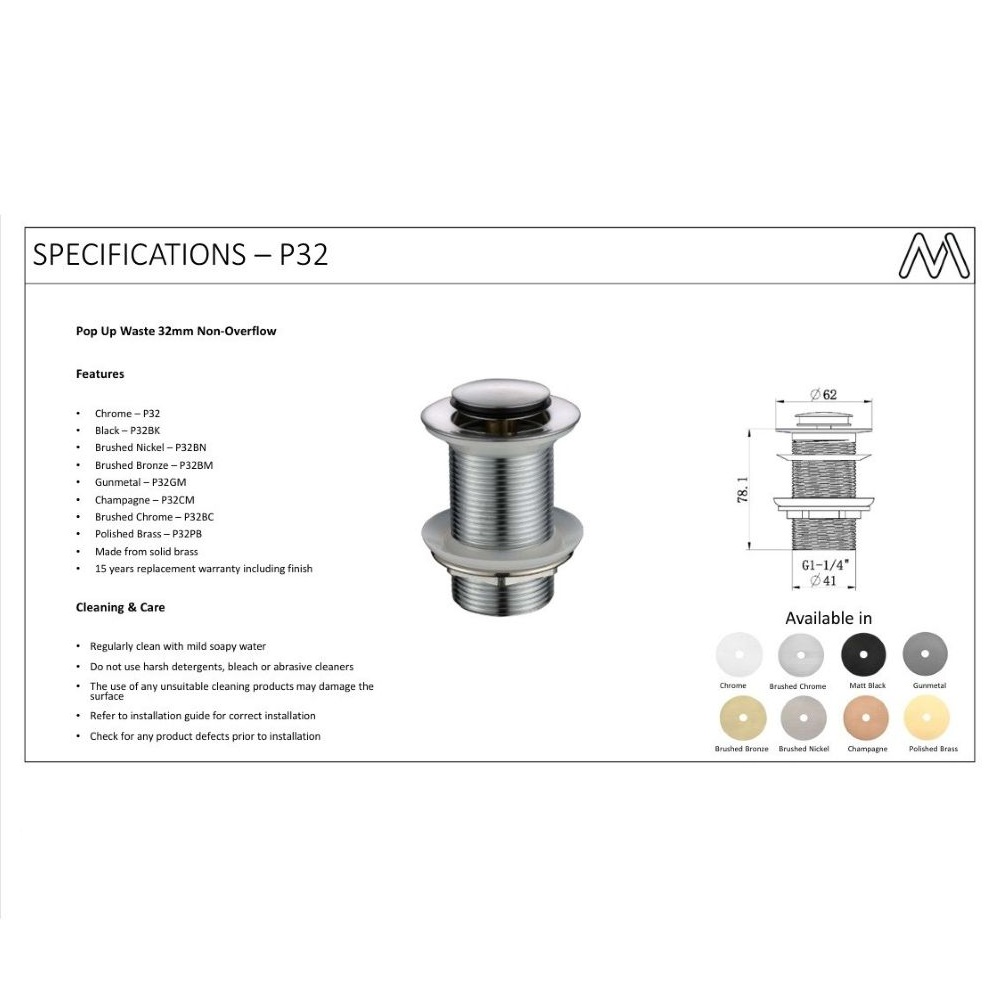 The Modern National Pop-Up Waste in 32mm size is designed without an overflow feature, perfect for contemporary bathroom sinks. Crafted from durable PVD champagne, this sleek and stylish accessory adds a touch of luxury to your bathroom design.