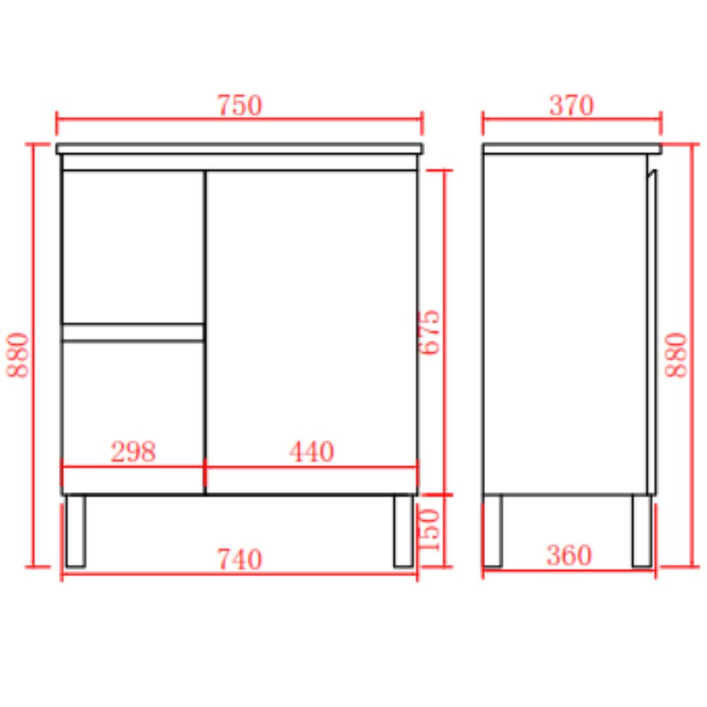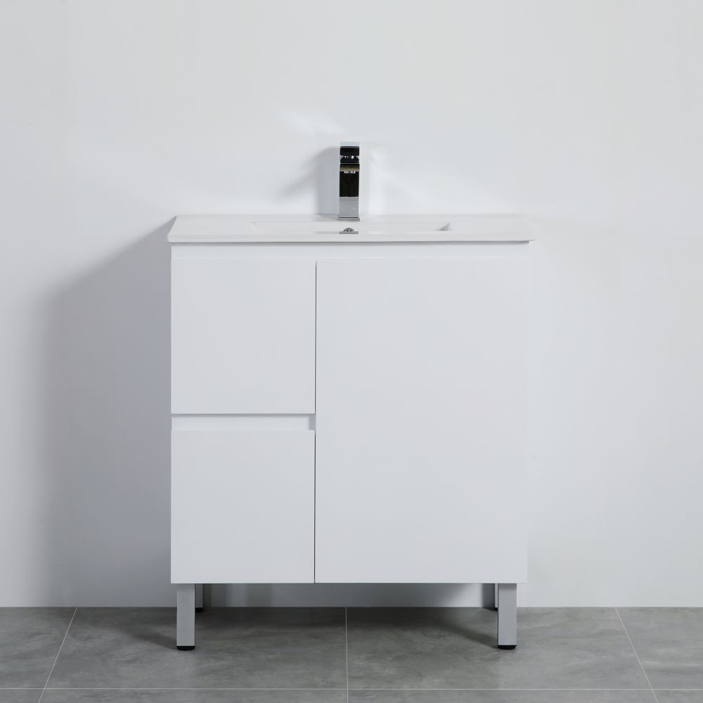 Introducing a sleek floor-mounted vanity in gloss white with a left-hand drawer design. Made from PVC material, this slim and stylish vanity measures 750mm and includes a top for added convenience. Upgrade your bathroom with this contemporary and functional piece.