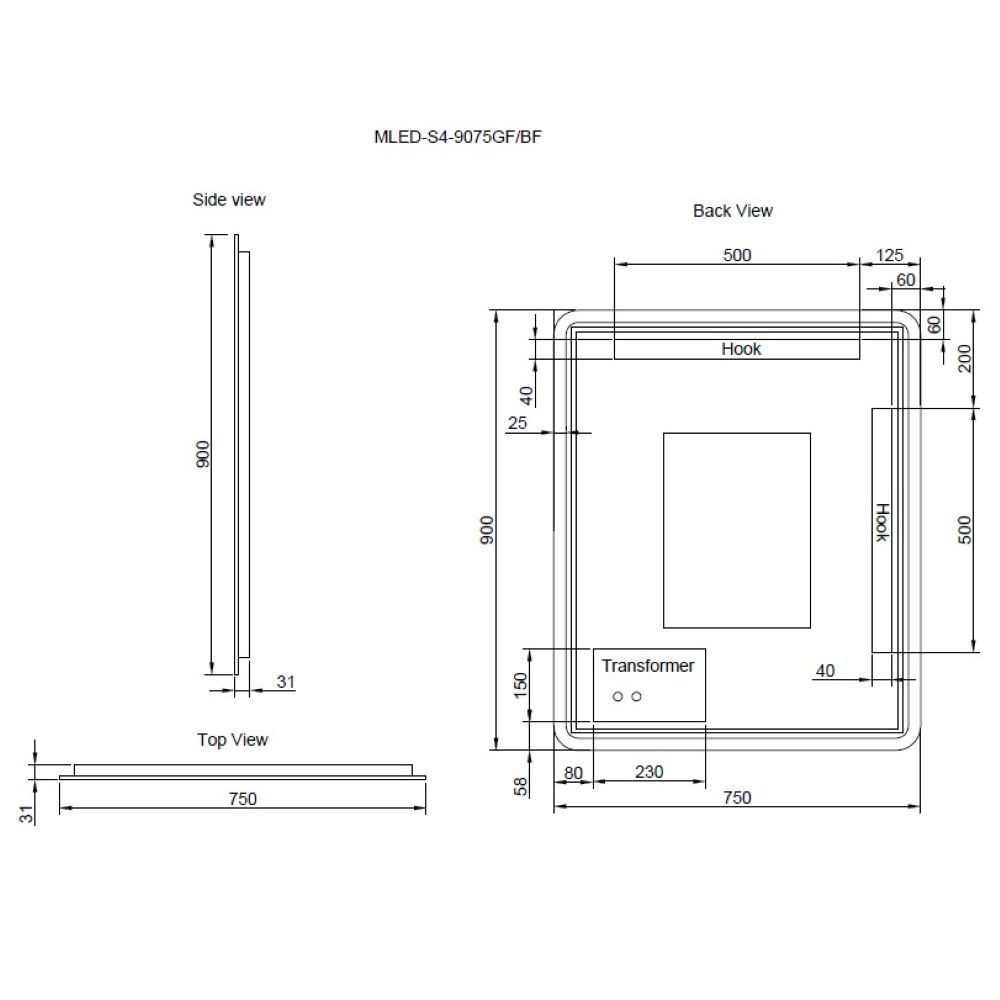 Dimensions 900 × 750 × 31 mm