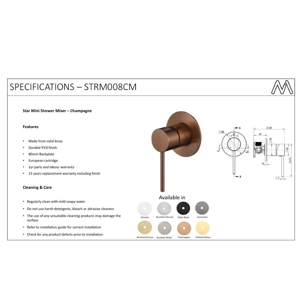 The STAR MINI Shower Mixer 80mm features a luxurious PVD Champagne finish, adding a touch of elegance to your bathroom. This compact and stylish mixer offers precise control of water temperature and pressure, creating a relaxing shower experience. Upgrade your bathroom with this high-quality and modern fixture.