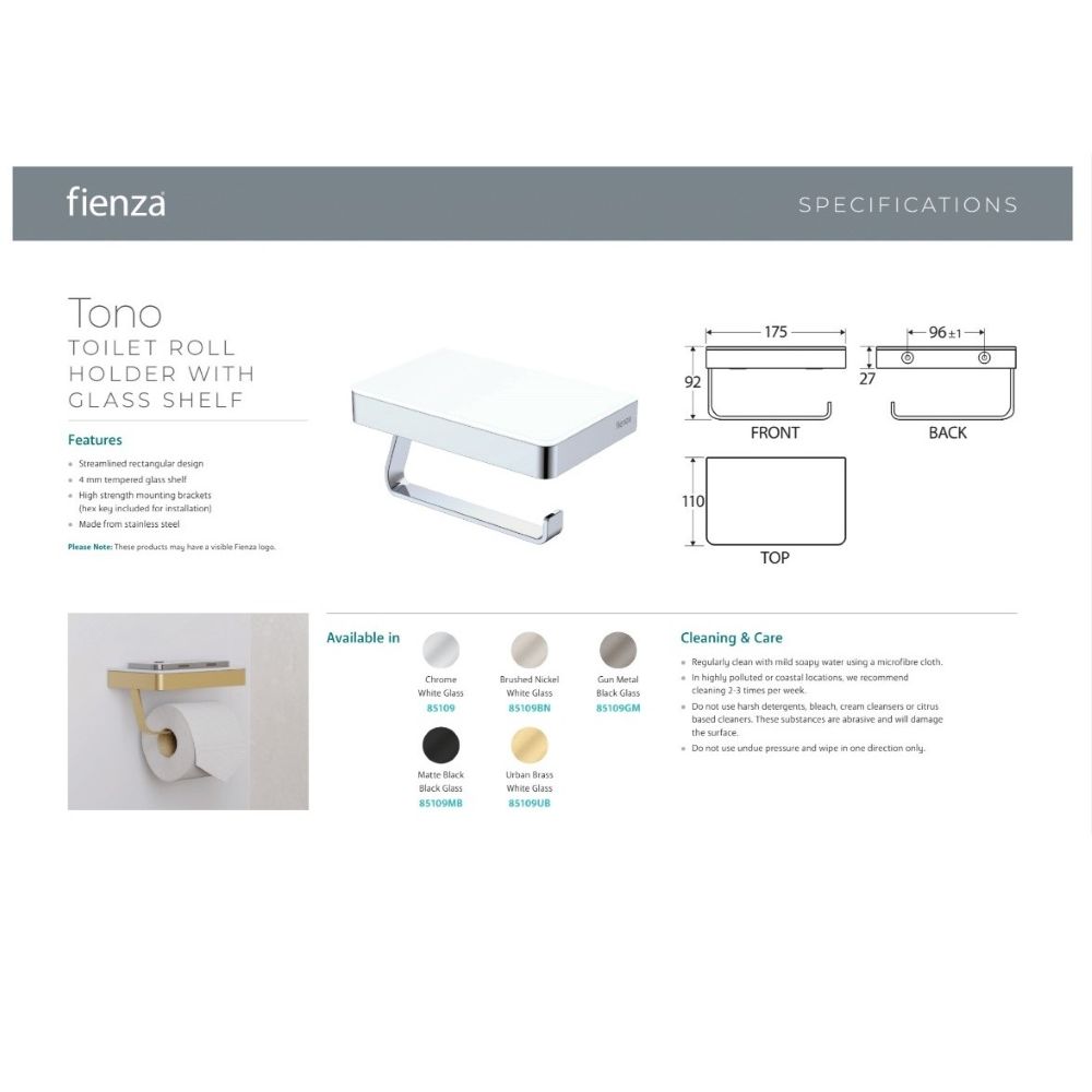 The TONO Toilet Roll Holder with a stylish glass shelf in a shiny gun metal finish is a practical and chic addition to any bathroom. It provides a convenient space to hold your toilet paper while offering a shelf to place essential items like toiletries or decorative accents.