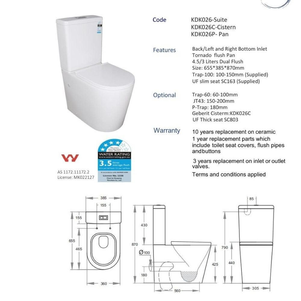 - 4.5/3 Liters Dual Flush